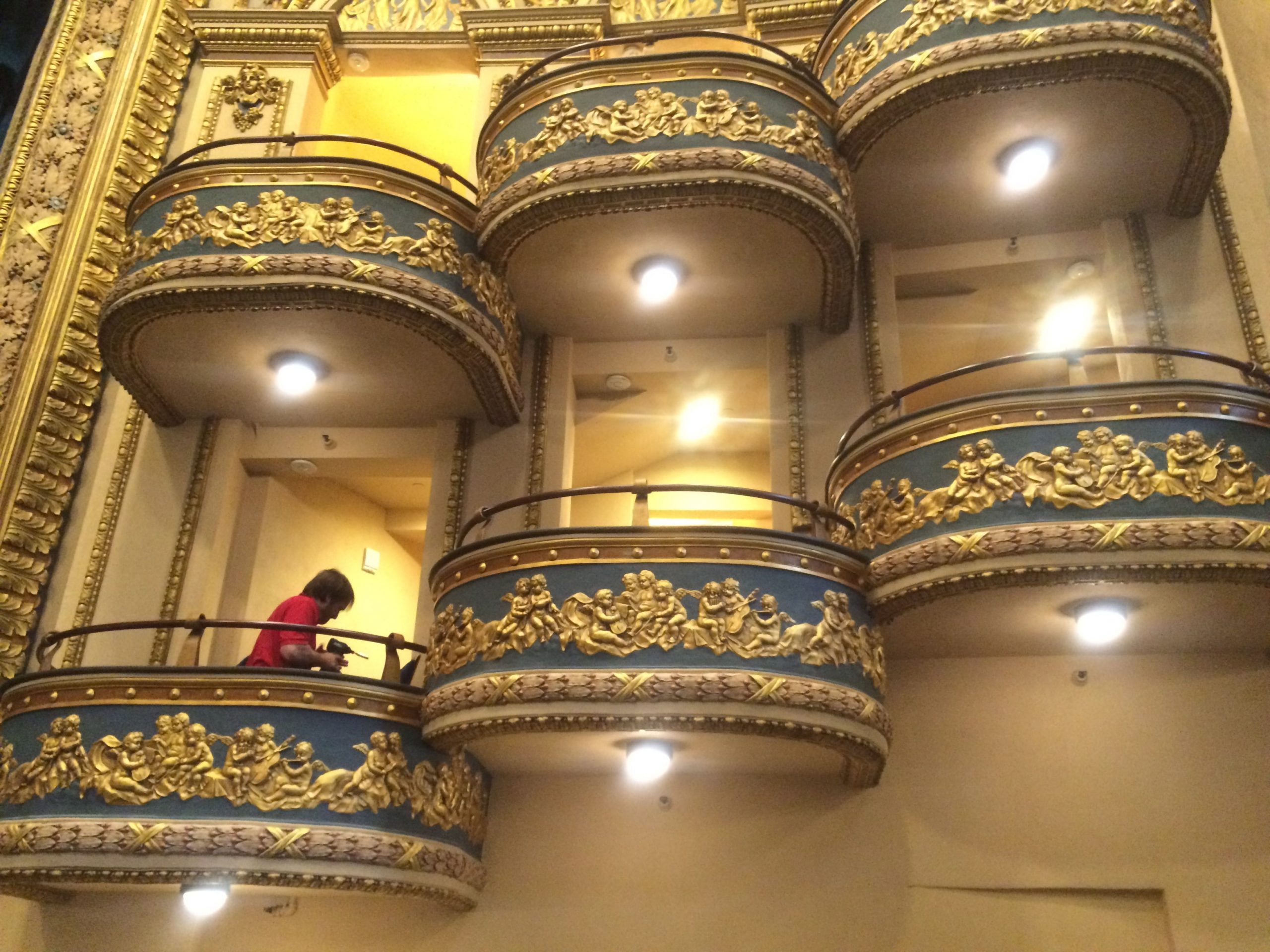 Andy Harris installs seats in the Lyric's new opera boxes. The theater's original opera boxes were shaved off in the 50s.