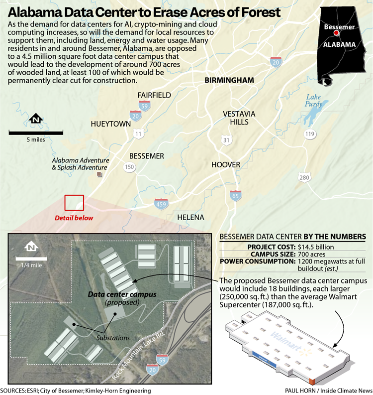 A document produced by Evans & Evans, the law firm representing the developer, suggests that at total buildout, the proposed data center campus would consume around 1,200 megawatts of energy. That’s more than 90 times the amount of energy used by all residences in Bessemer and more than 10 times the amount of energy used by all residences in Birmingham annually. An increase of that magnitude would amount to a 10 percent rise in Alabama Power’s total electricity demand statewide.