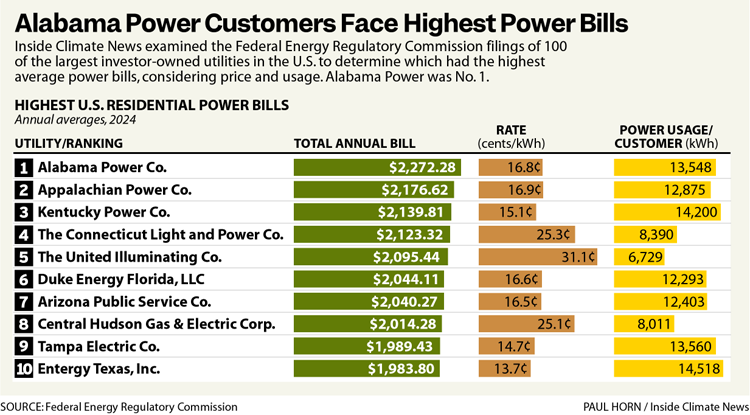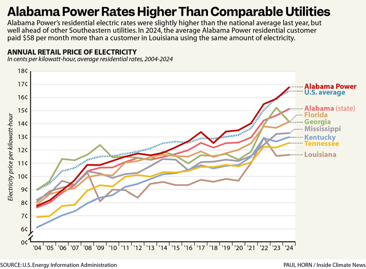Alabama Power’s average residential rate last year was 16.77 cents per kilowatt-hour, higher than the national average of 16.48 cents and 35th highest out of 100 utilities examined by Inside Climate News.