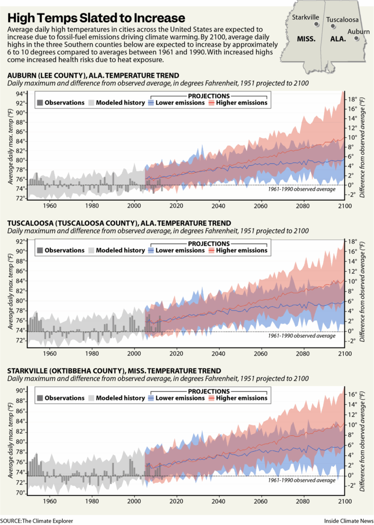 A federal government analysis of climate modelling predicts that by the 2040s, the average maximum daily temperature in Tuscaloosa, the home of the University of Alabama, will be 5 degrees Fahrenheit above the average registered from 1961 to 1990.