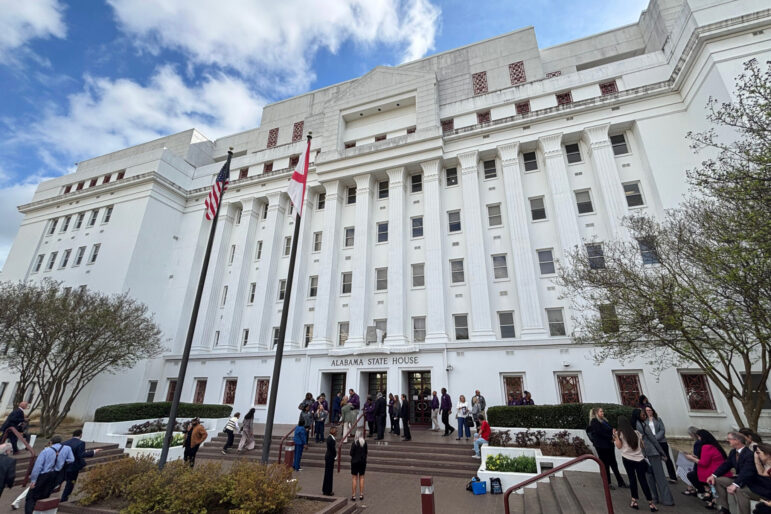 Crowds gather in front of the Alabama State House in Montgomery, Ala. The building houses offices and meeting rooms for the Alabama Legislature. (Dennis Pillion/Inside Climate News)