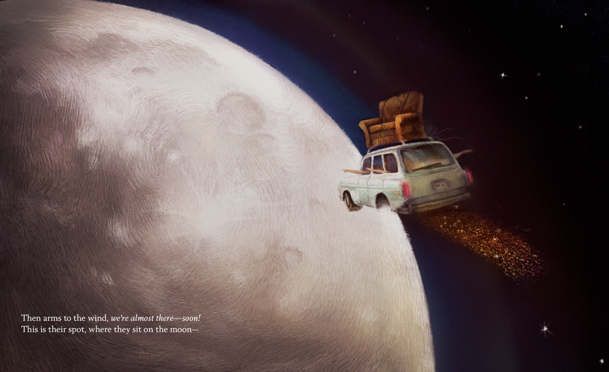 “You can just see little glimmers of what’s going on,” — car headlights dot the page, illuminating the tall grasses and hopping rabbits, explains Seiferling. And then the car takes flight — “lighter than porch moths, they flutter and drift,” Hoefler writes. The family is headed straight for the moon, where they unpack their couch and settle in for some celestial stargazing.